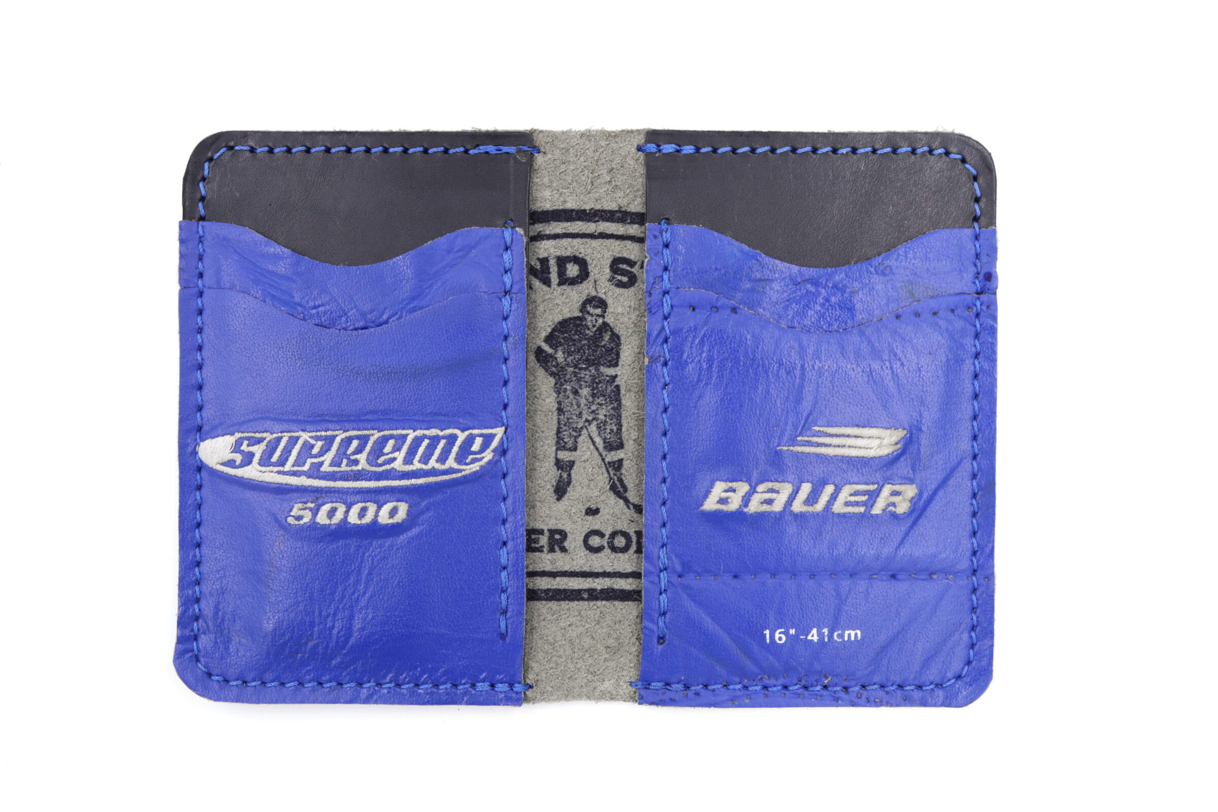 The 6 Slot Wallet is handcrafted from full-grain, oil-tanned leather and fused with vintage player gear leather. It features six card slots, two of wh