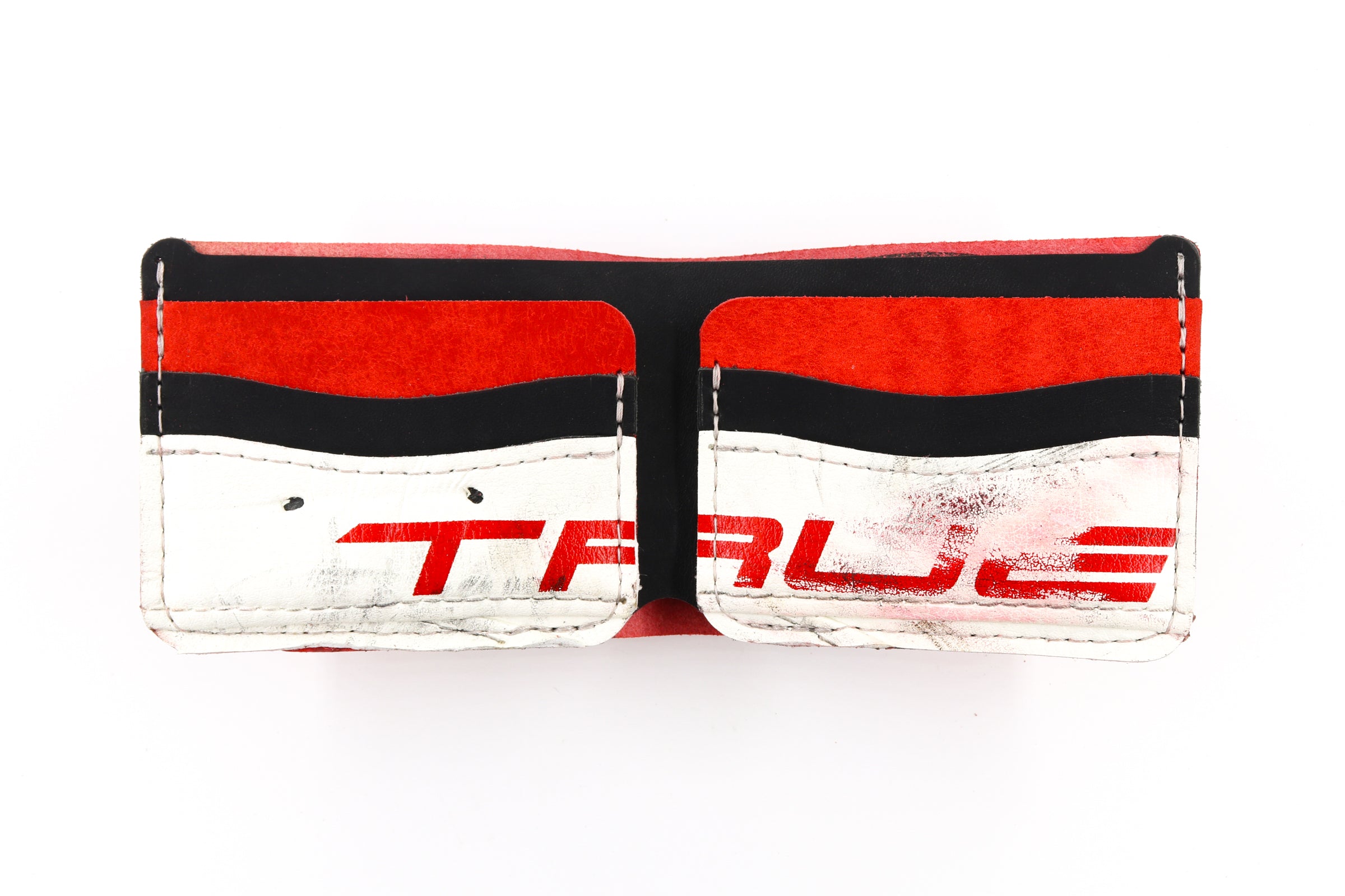 The 6 Slot Bifold Wallet is handcrafted from full-grain, oil-tanned leather and blended with vintage goalie glove leather on the lower left and right