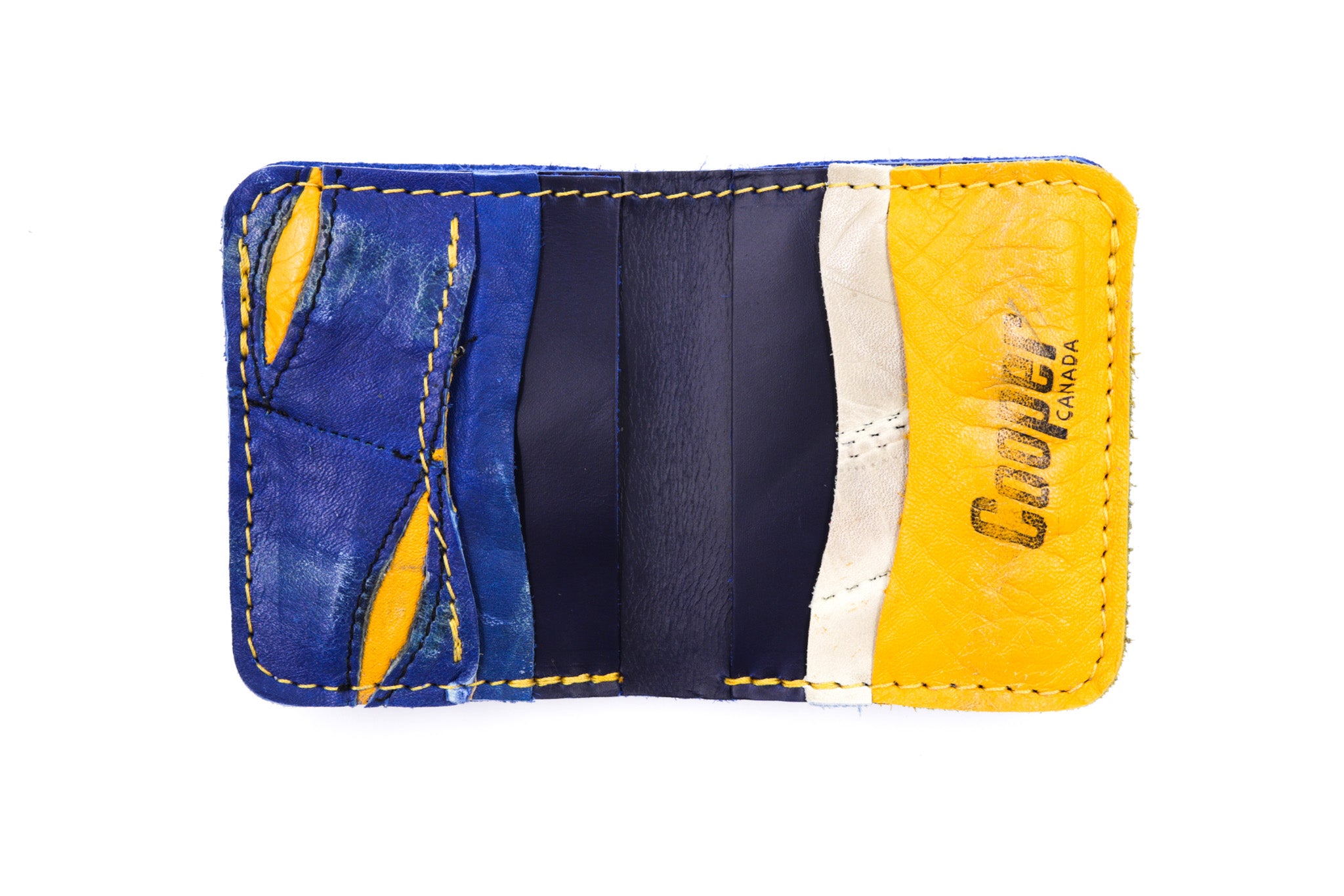 The 6 Slot Square Wallet is handcrafted from full-grain, oil-tanned leather and blended with vintage player gear leather. It features six card slots and a top bill fold compartment for easy bill storage. Carry on the heritage of the games passed with this sleek and functional leather wallet.