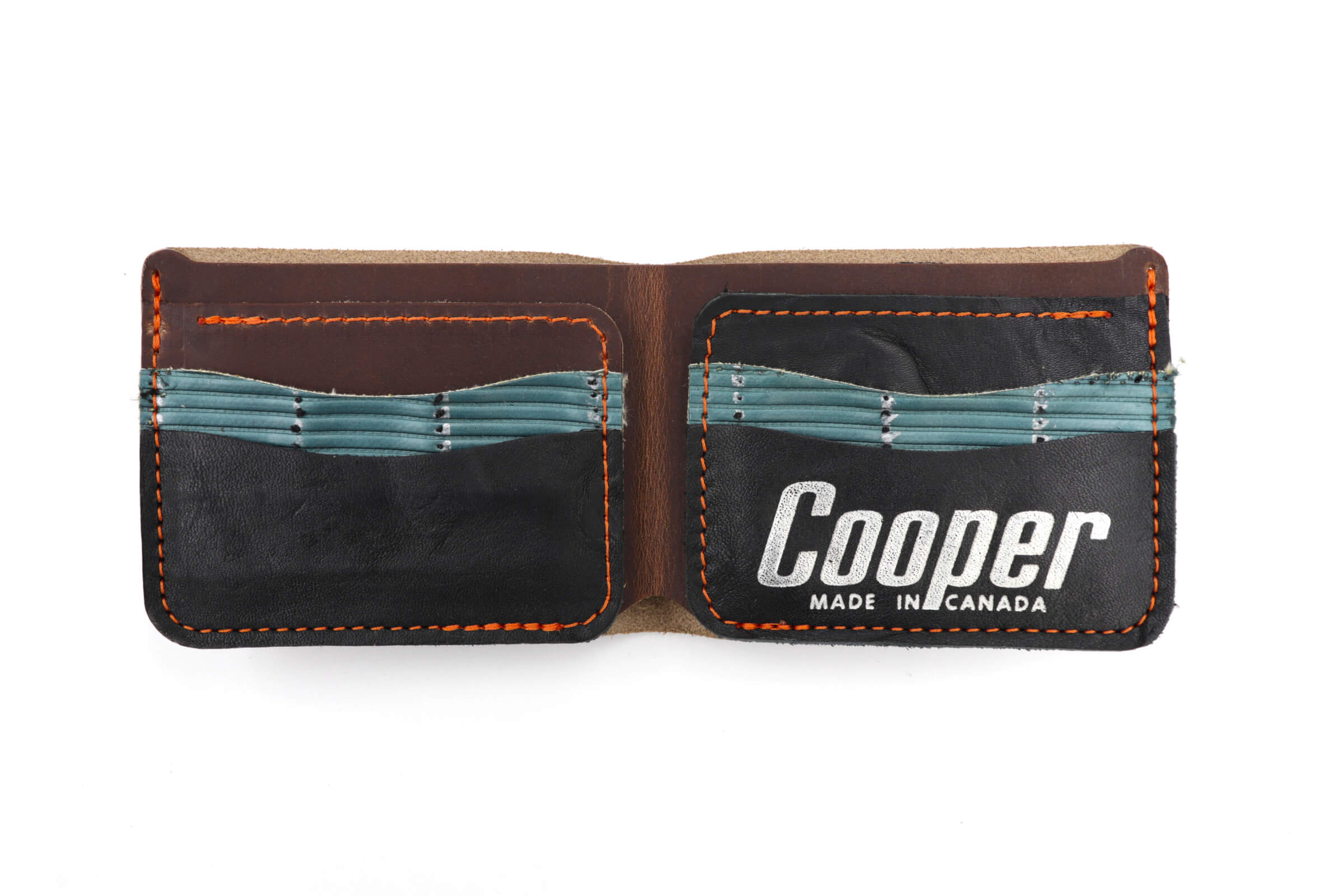 The 6 Slot Bifold Wallet is handcrafted from Horween Leather and blended with vintage player glove leather on the lower left and right card pockets. T