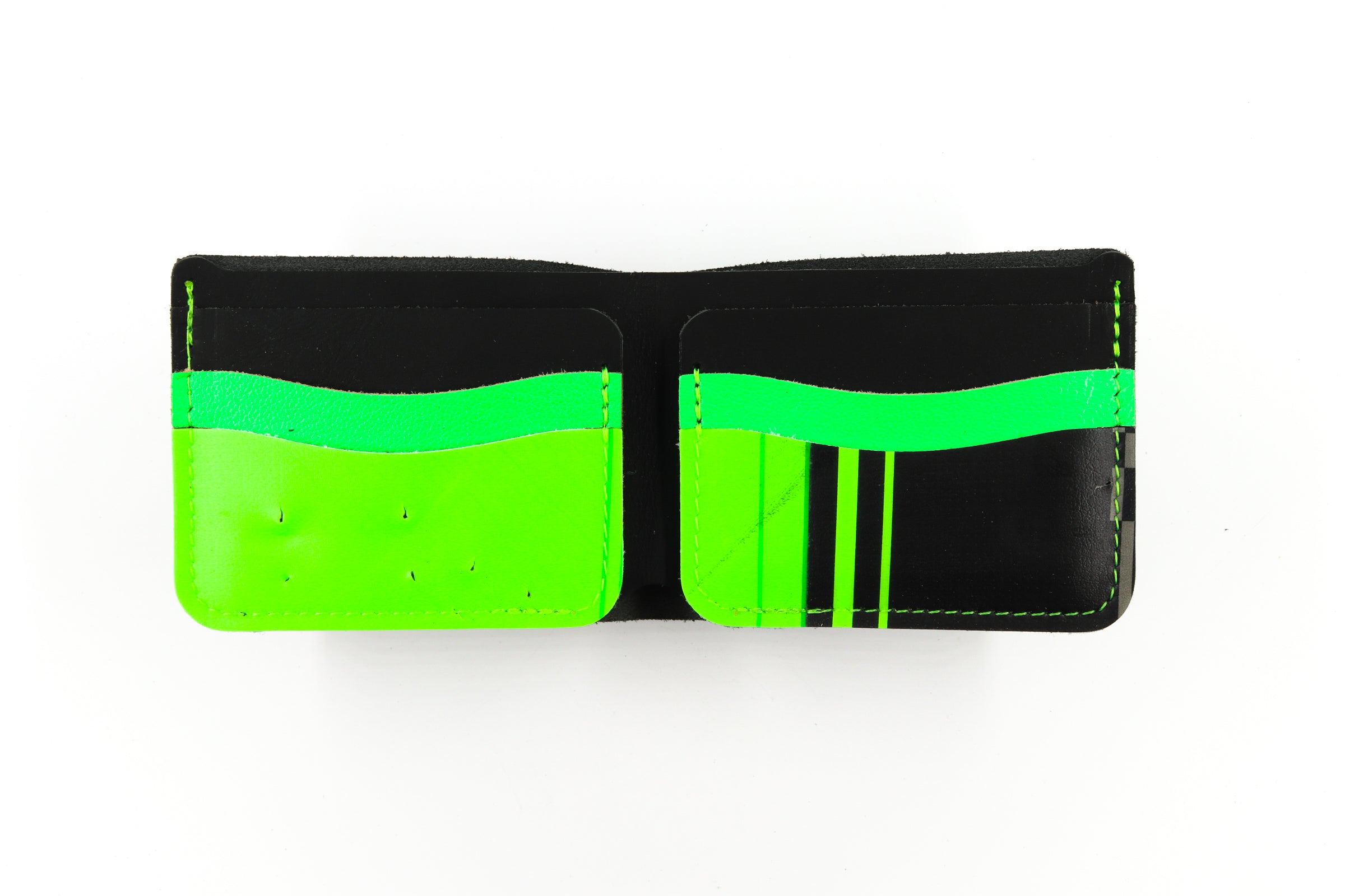 The 6 Slot Bifold Wallet is handcrafted from full-grain, oil-tanned leather and blended with vintage goalie glove leather on the lower left and right