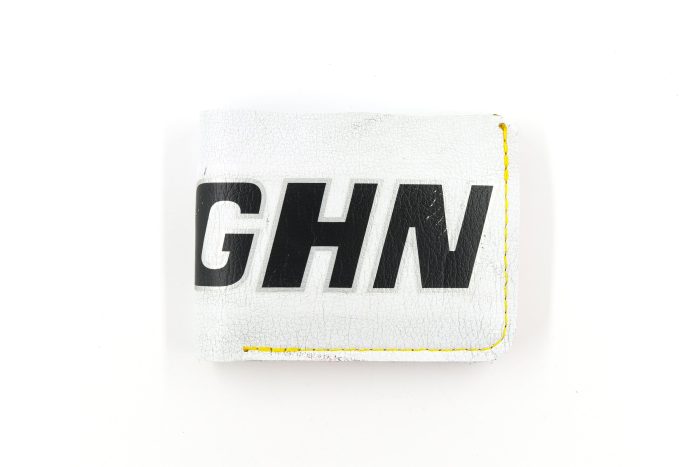 The 6 Slot Bifold Wallet is handcrafted from full-grain, oil-tanned leather and blended with vintage goalie glove leather on the lower left and right