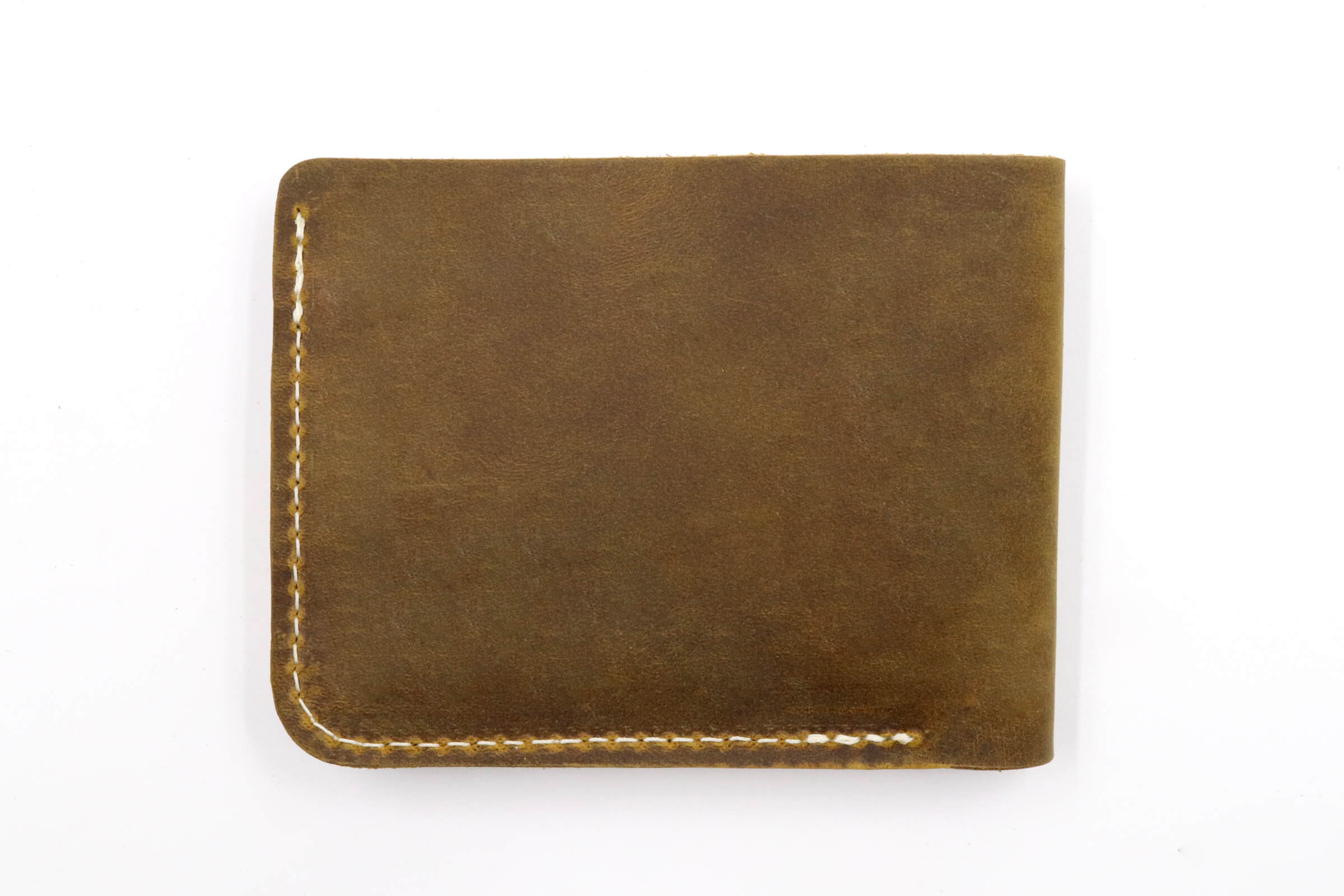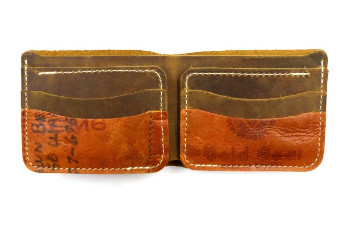 The 6 Slot Bifold Wallet is handcrafted from full-grain, oil-tanned leather and blended with vintage goalie glove leather on the lower left and right