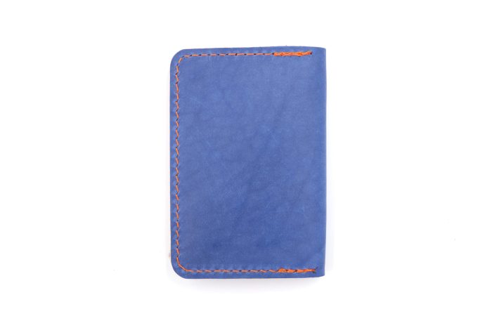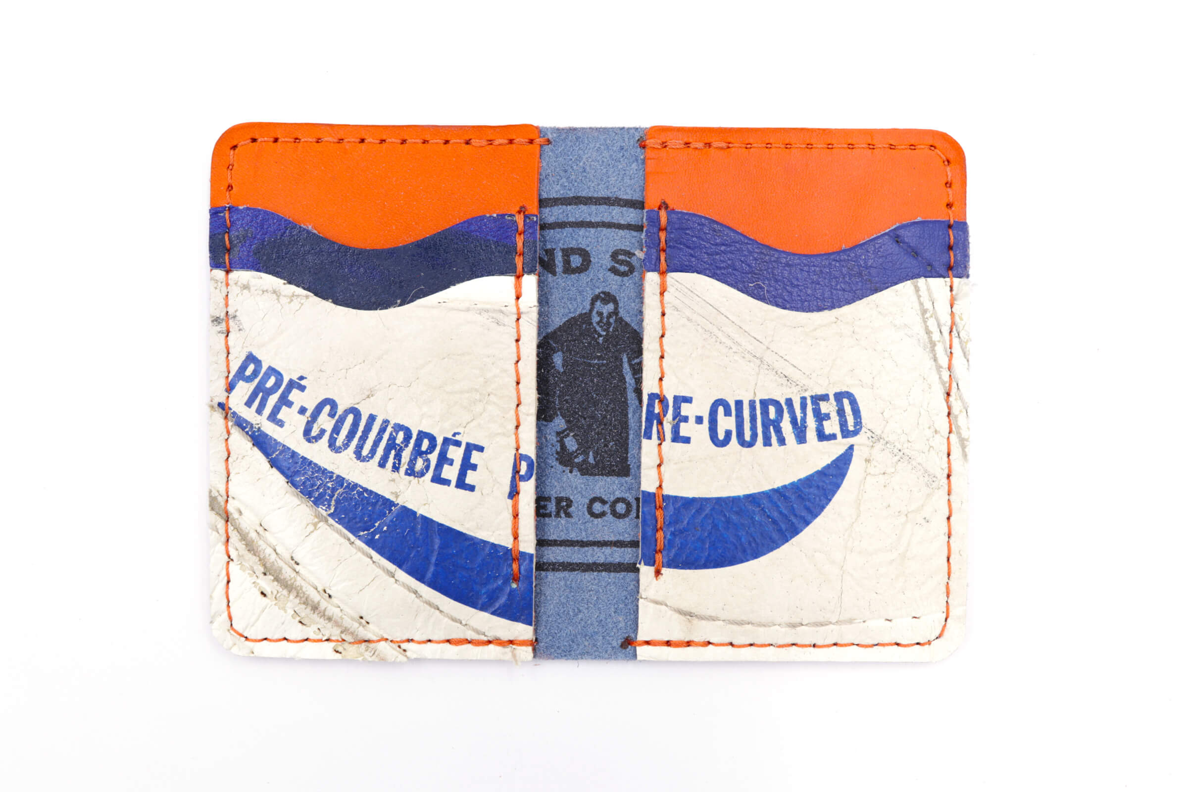 The 6 Slot Wallet is handcrafted from Tempesti Blue leather and fused with vintage goalie gear leather. It features six card slots, two of which are h