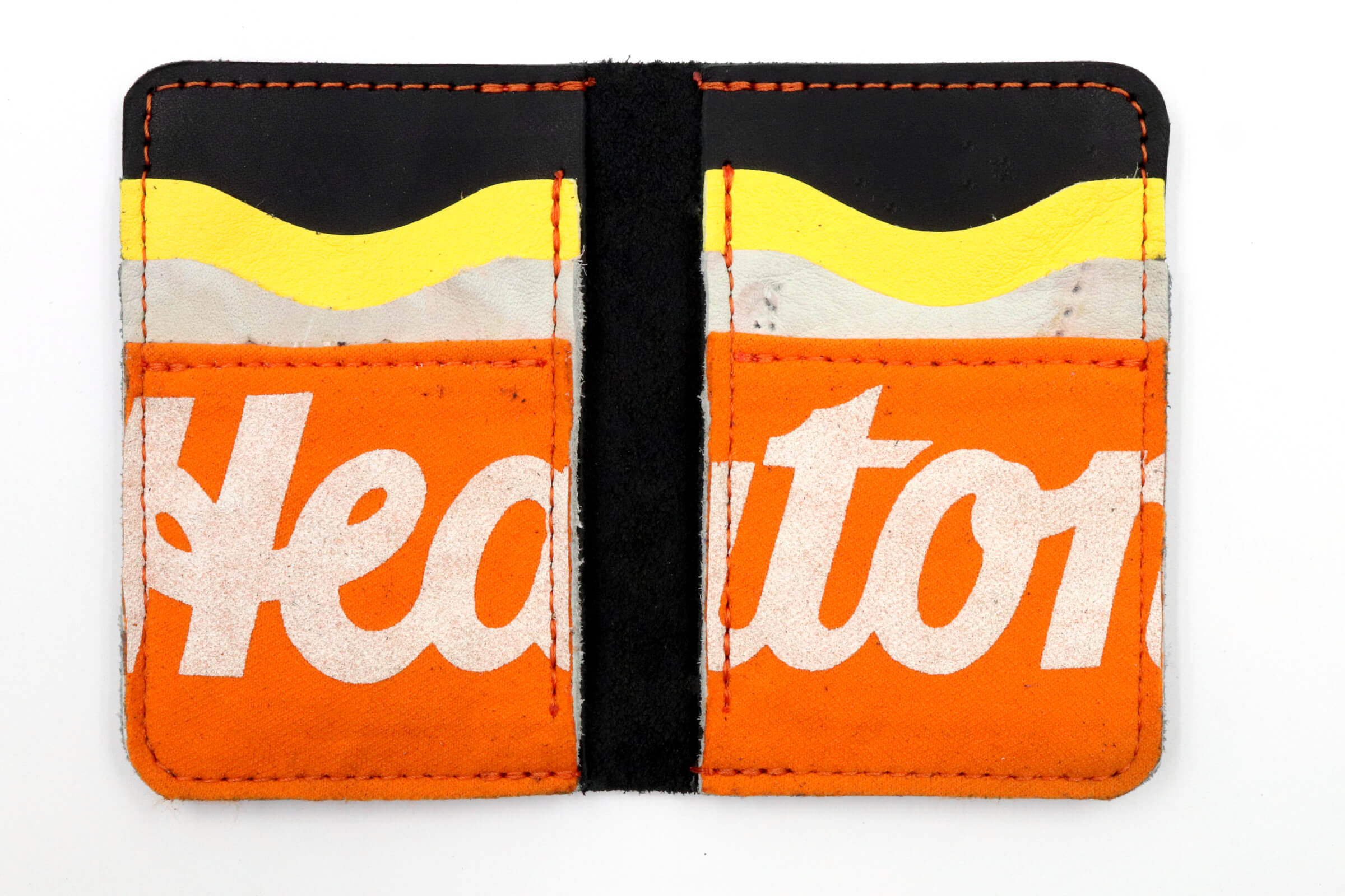 The 6 Slot Wallet is handcrafted from full-grain, oil-tanned leather and fused with vintage goalie gear leather. It features six card slots, two of wh