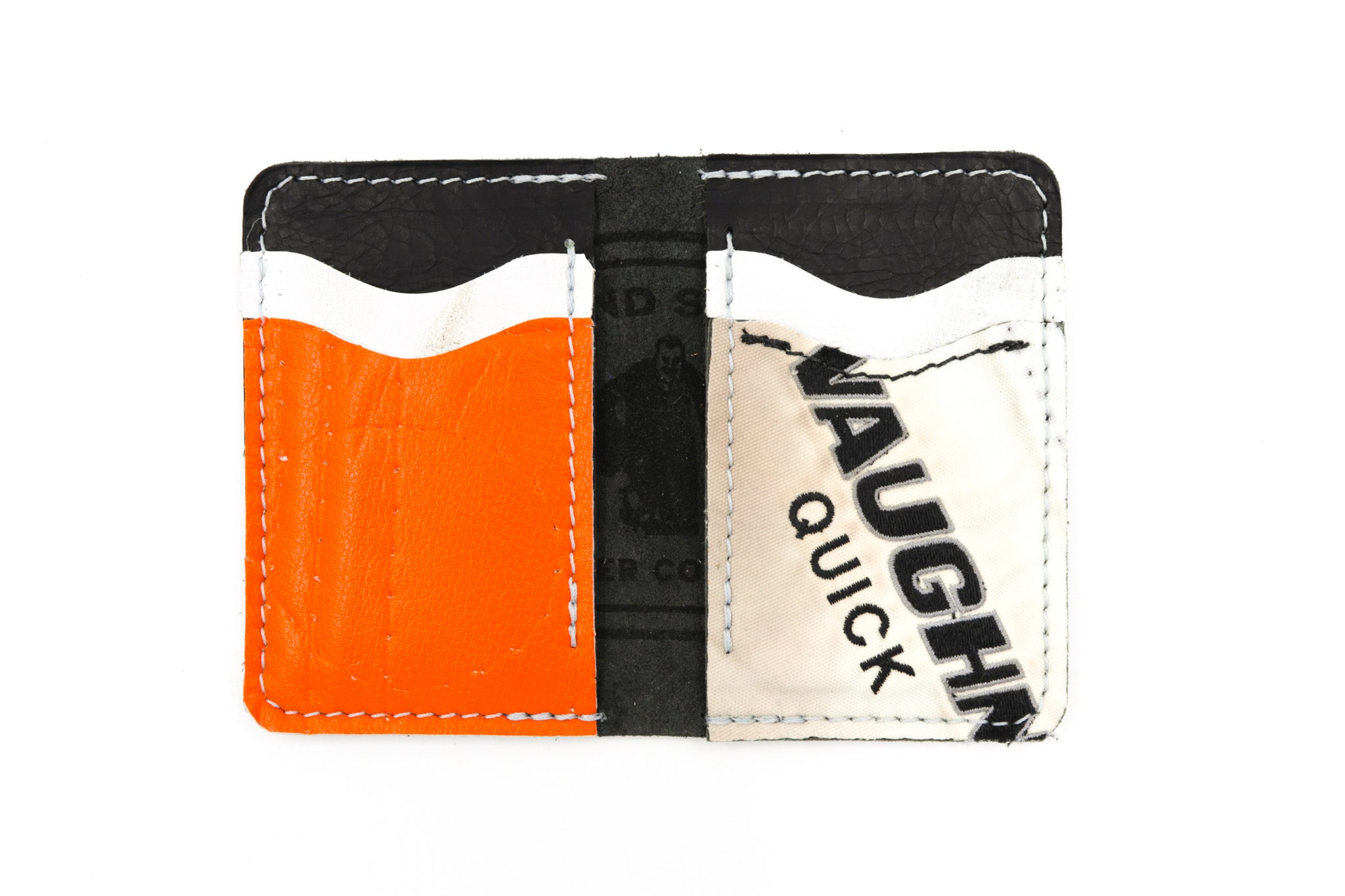 The 6 Slot Wallet is handcrafted from full-grain, oil-tanned leather and fused with vintage goalie gear leather. It features six card slots, two of wh