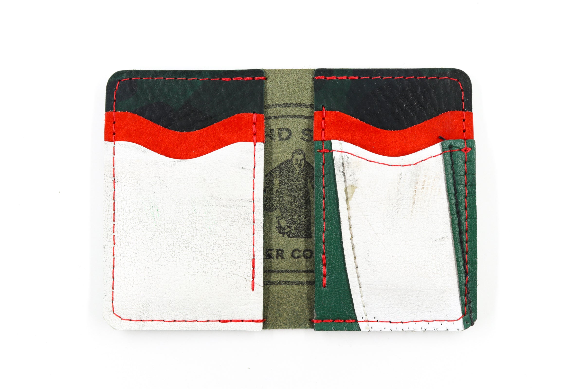 The 6 Slot Wallet is handcrafted from full-grain, oil-tanned leather and fused with vintage goalie gear leather. It features six card slots, two of wh