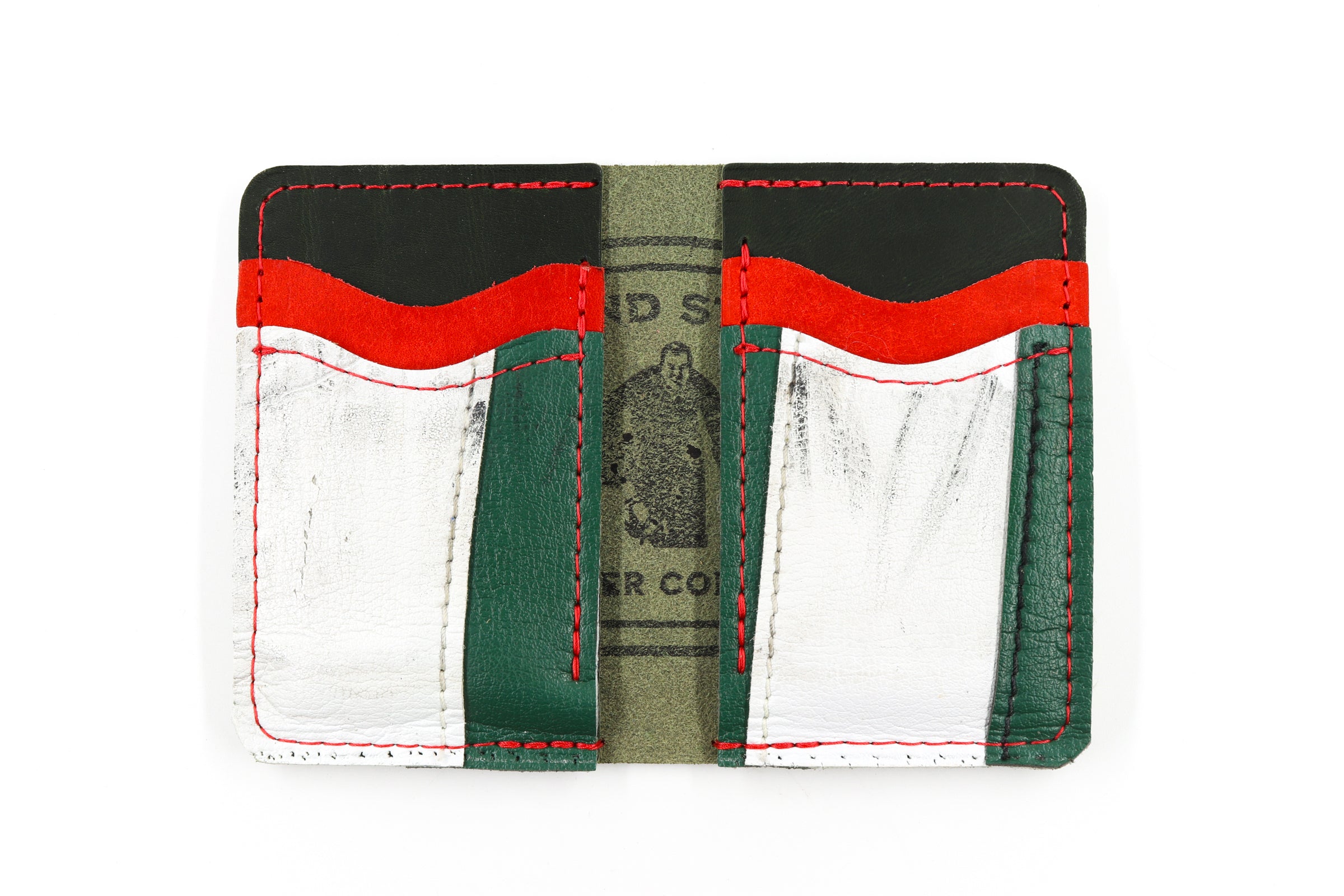 The 6 Slot Wallet is handcrafted from full-grain, oil-tanned leather and fused with vintage goalie gear leather. It features six card slots, two of wh