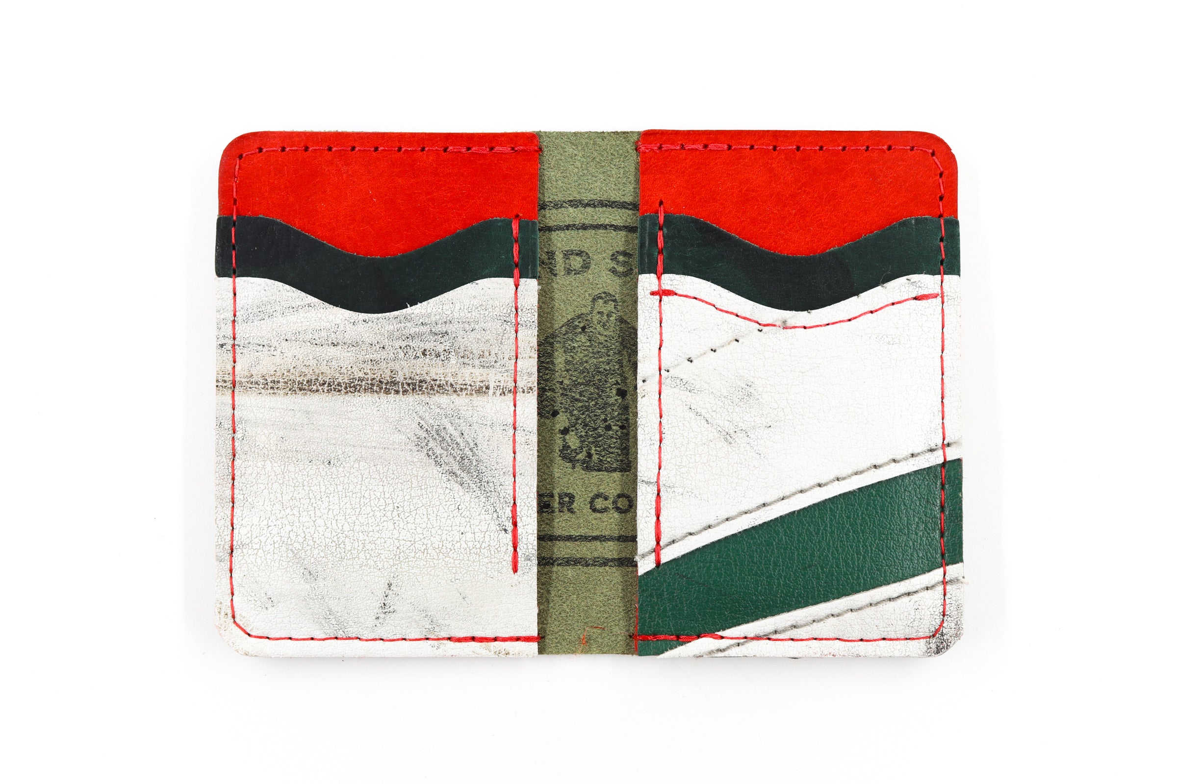 The 6 Slot Wallet is handcrafted from full-grain, oil-tanned leather and fused with vintage goalie gear leather. It features six card slots, two of wh