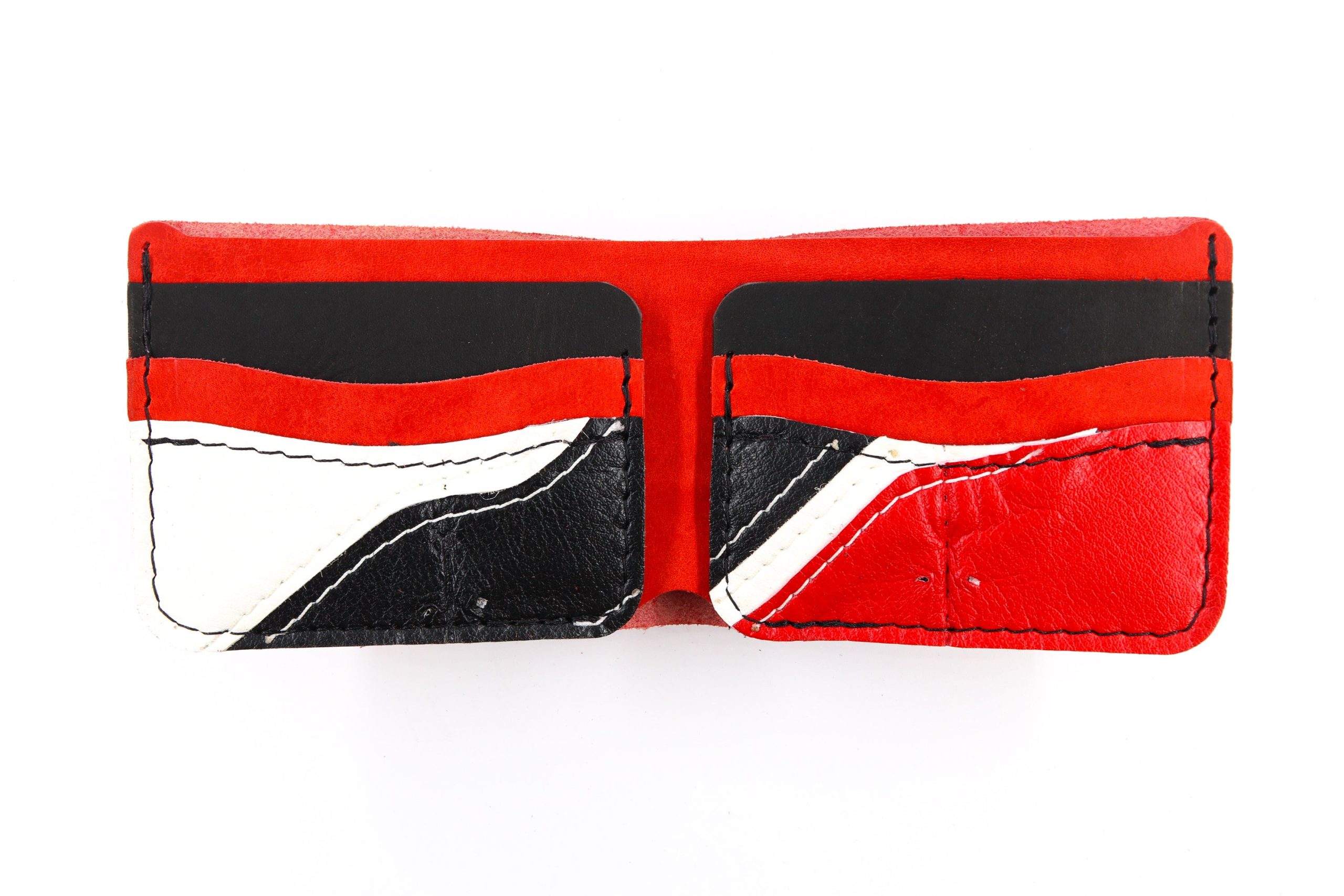 The 6 Slot Bifold Wallet is handcrafted from full-grain, oil-tanned leather and blended with vintage goalie glove leather on the lower left and right