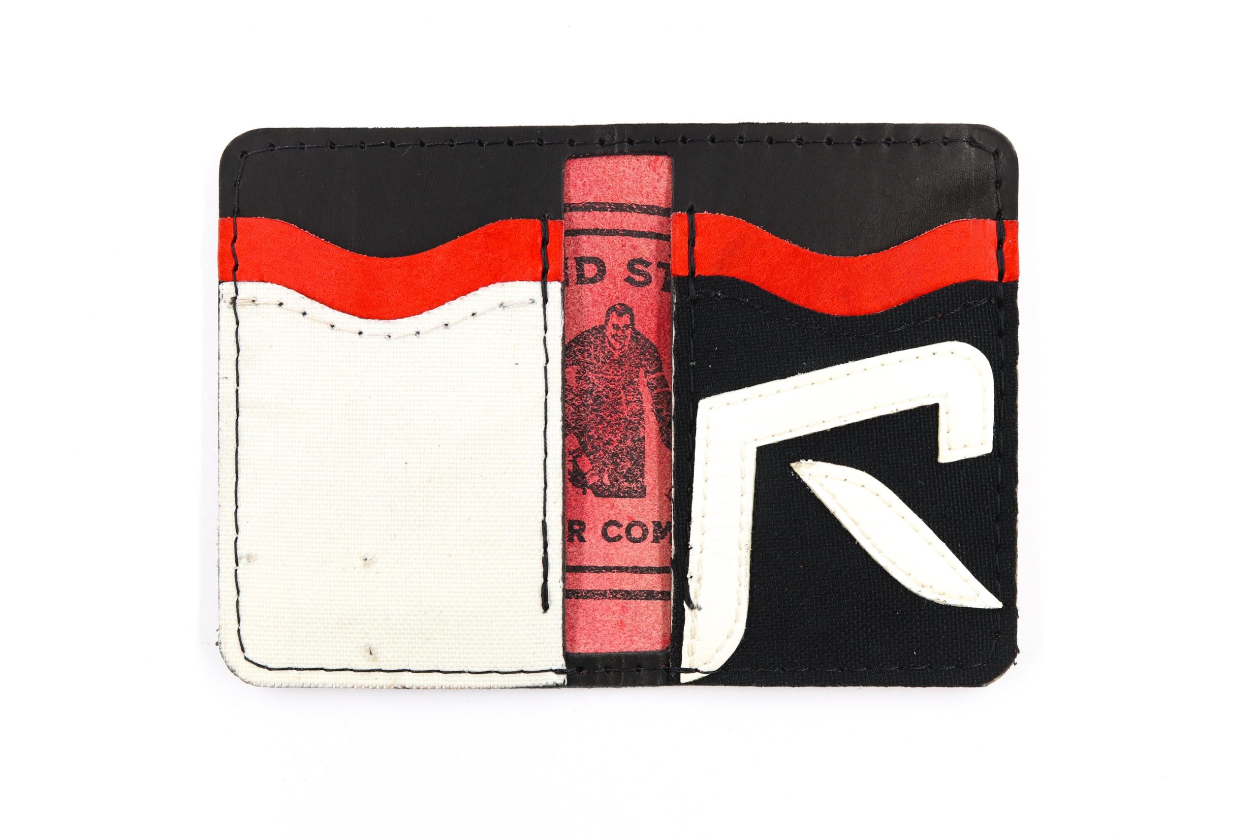 The 6 Slot Wallet is handcrafted from full-grain, oil-tanned leather and fused with vintage goalie gear leather. It features six card slots, two of wh