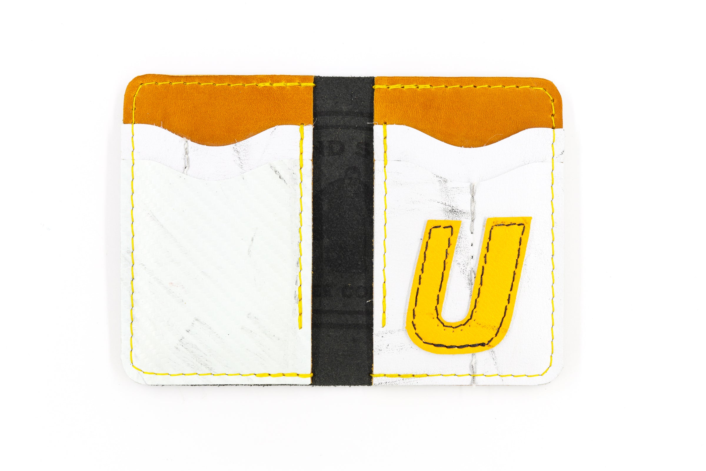 The 6 Slot Wallet is handcrafted from full-grain, oil-tanned leather and fused with vintage goalie gear leather. It features six card slots, two of wh