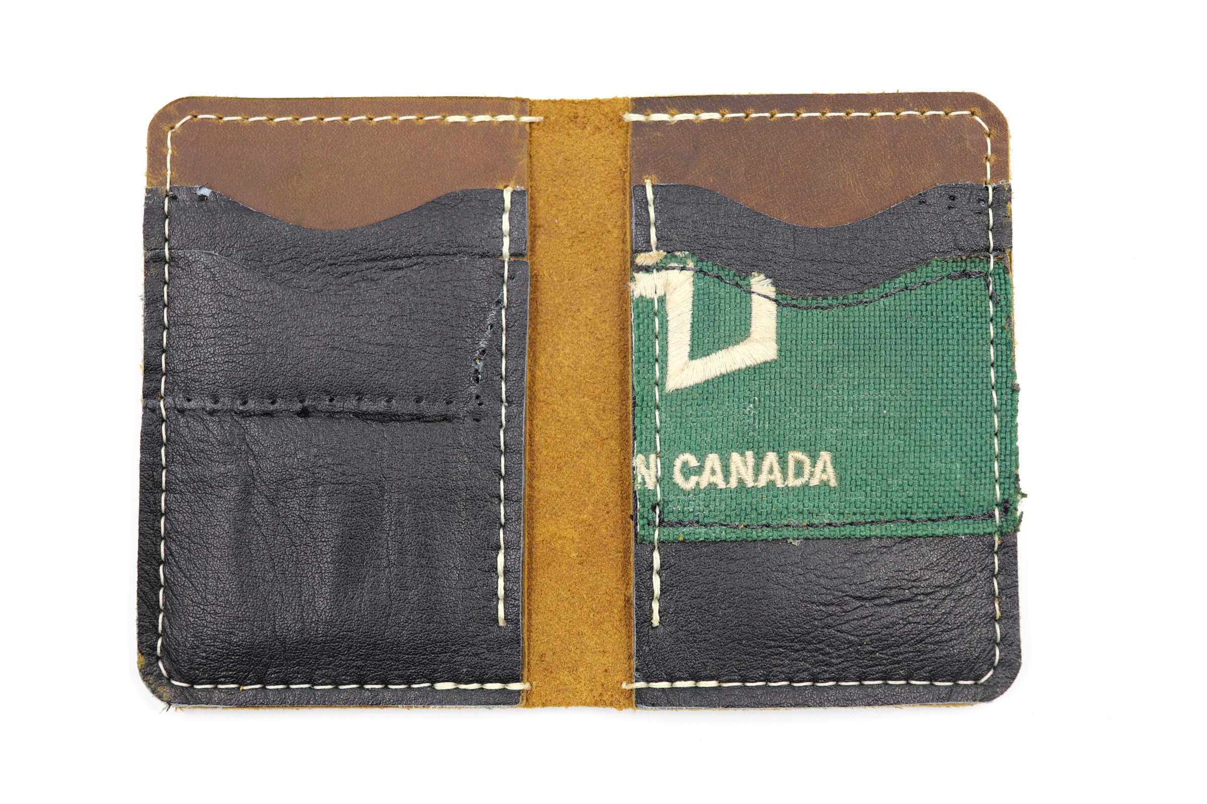 The 6 Slot Wallet is handcrafted from full-grain, oil-tanned leather, and fused with vintage goalie gear leather. It features six card slots, two of w