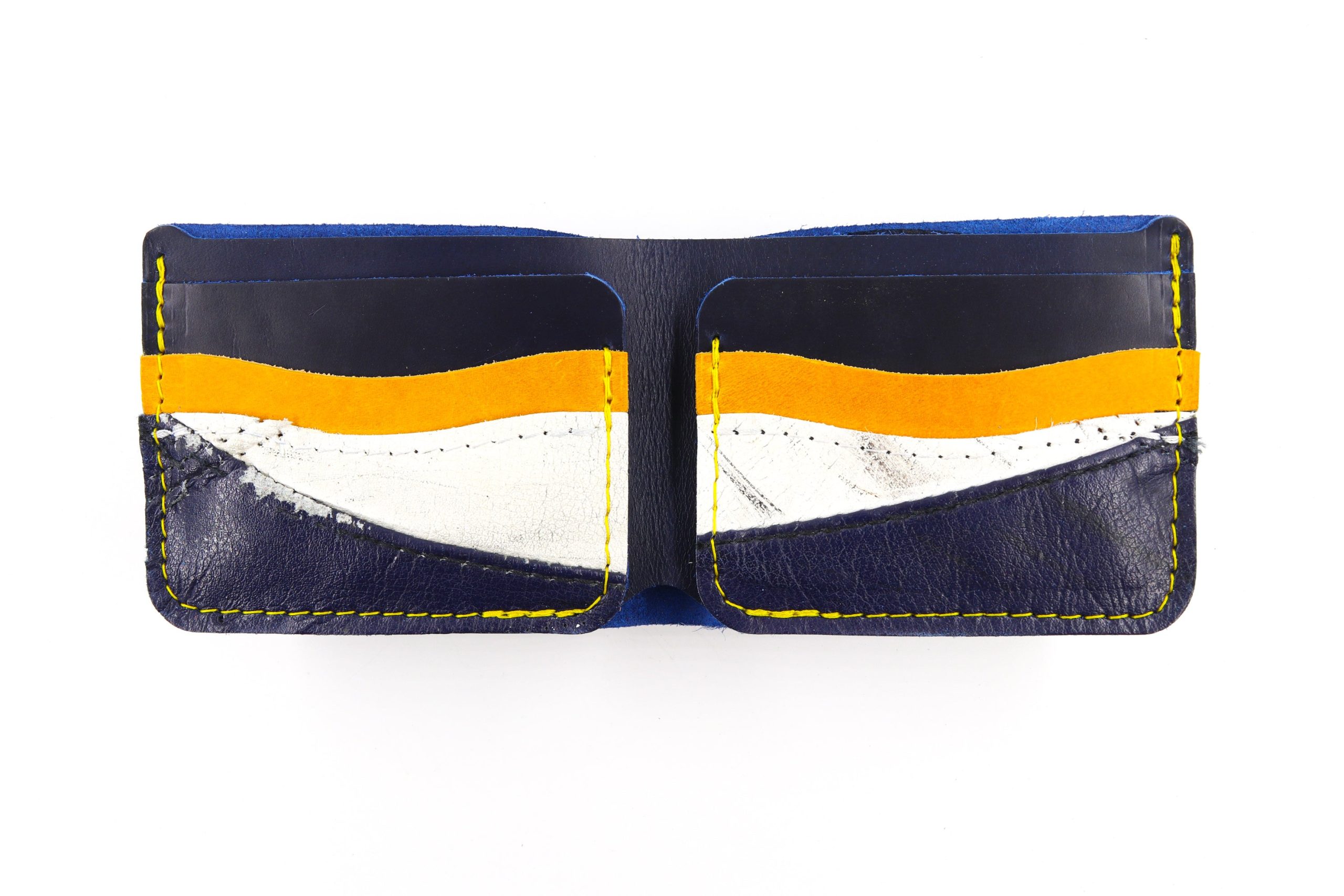 The 6 Slot Bifold Wallet is handcrafted from full-grain, oil-tanned leather and blended with vintage goalie glove leather on the lower left and right
