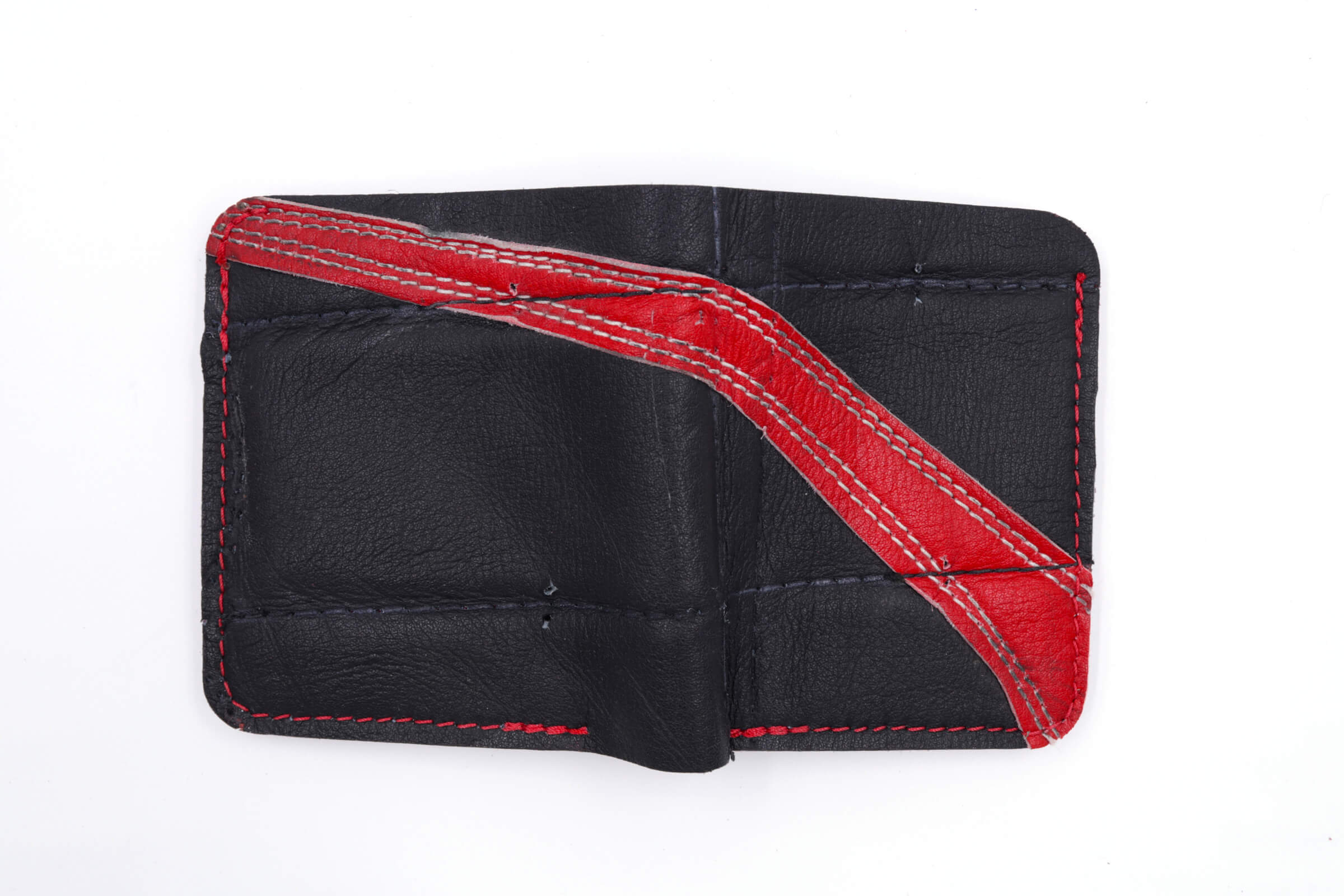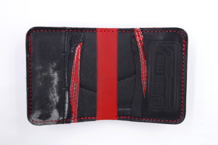 The 6 Slot Square Wallet is handcrafted from full-grain, oil-tanned leather and blended with vintage goalie gear leather. It features six card slots a