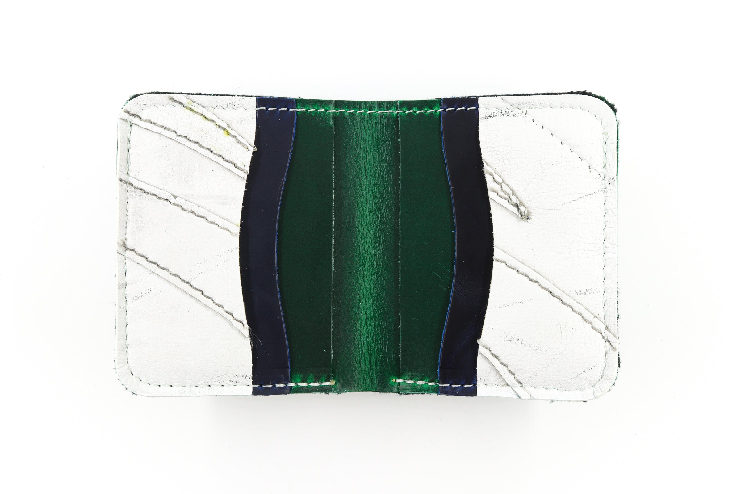 The 6 Slot Square Wallet is handcrafted from full-grain, oil-tanned leather and blended with vintage goalie gear leather. It features six card slots a
