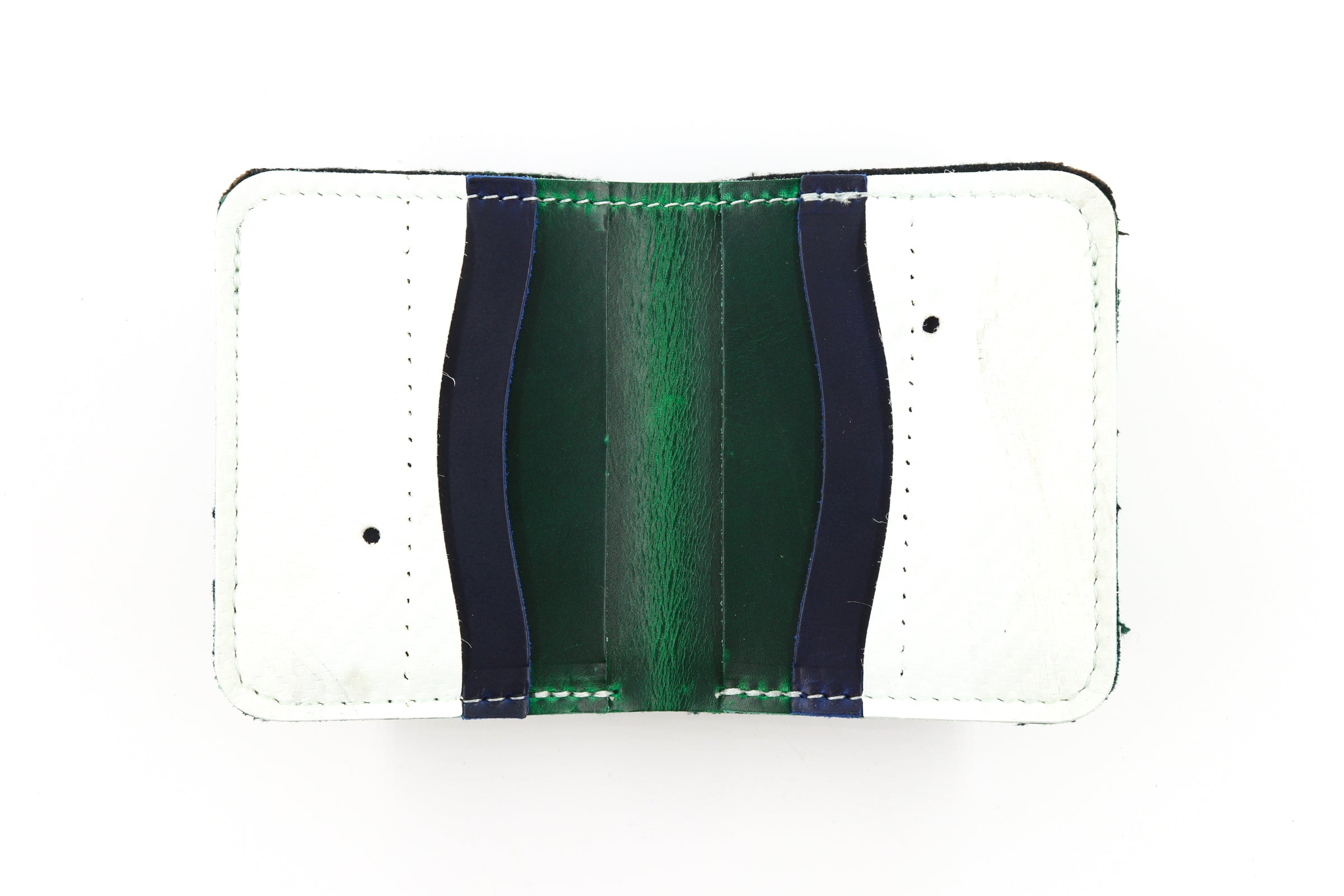 The 6 Slot Square Wallet is handcrafted from full-grain, oil-tanned leather and blended with vintage goalie gear leather. It features six card slots and a top bill fold compartment for easy bill storage. Carry on the heritage of the games passed with this sleek and functional leather wallet.