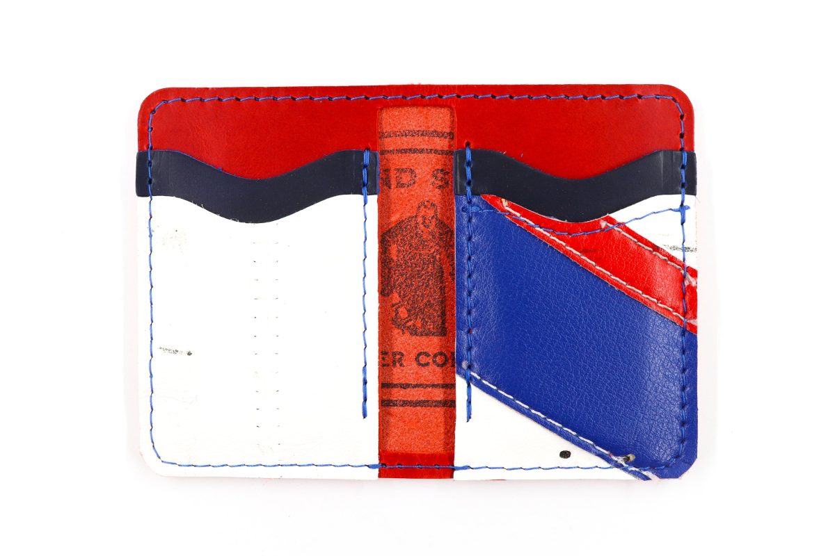The 6 Slot Square Wallet is handcrafted from and blended with vintage goalie gear leather. It features six card slots and a top bill fold compartment