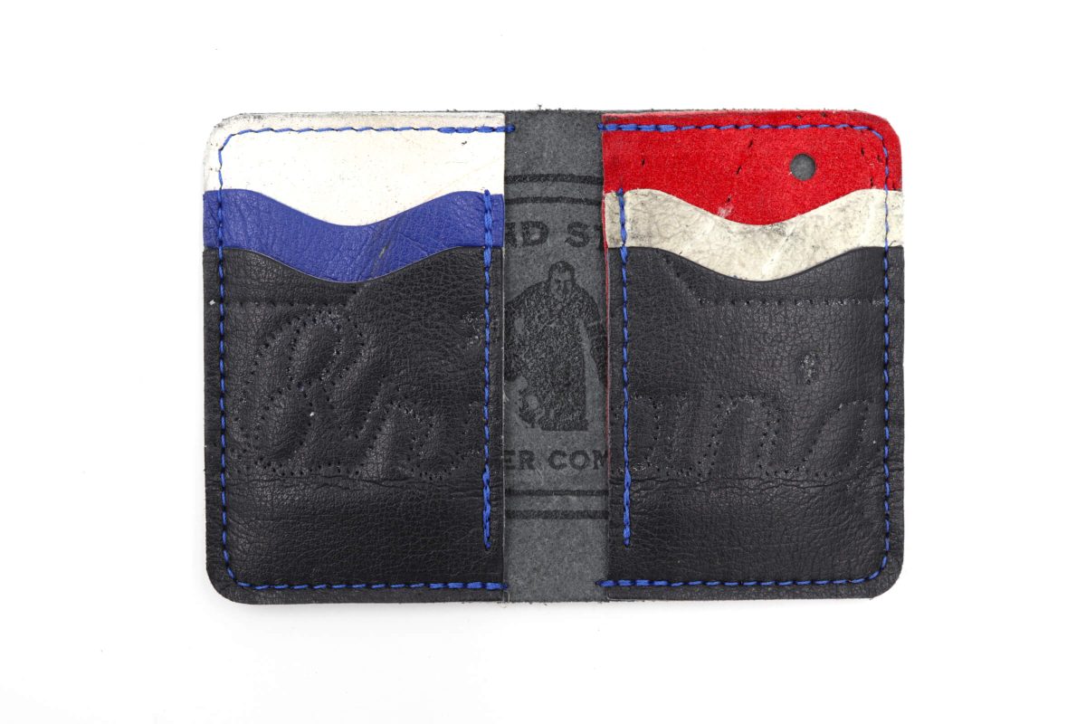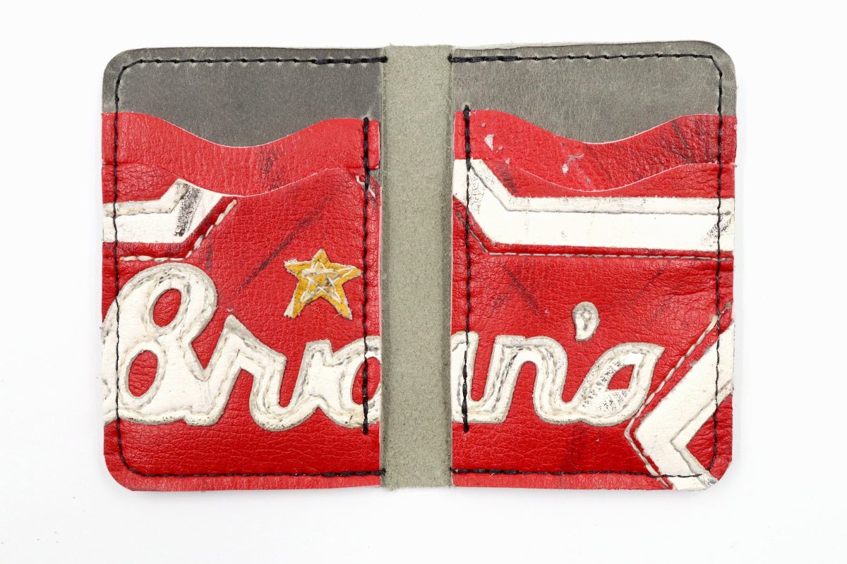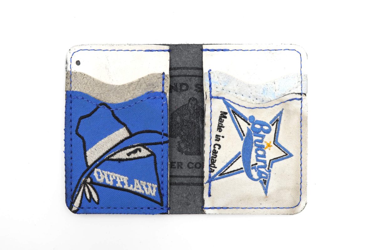 The 6 Slot Wallet is handcrafted from full-grain, oil-tanned leather and fused with vintage goalie gear leather. It features six card slots, two of wh