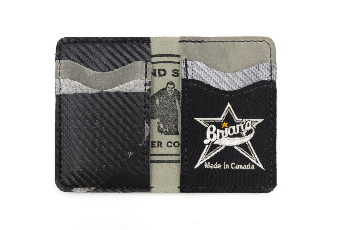 The 6 Slot Wallet is handcrafted from full-grain, oil-tanned leather and fused with vintage goalie gear leather. It features six card slots, two of wh