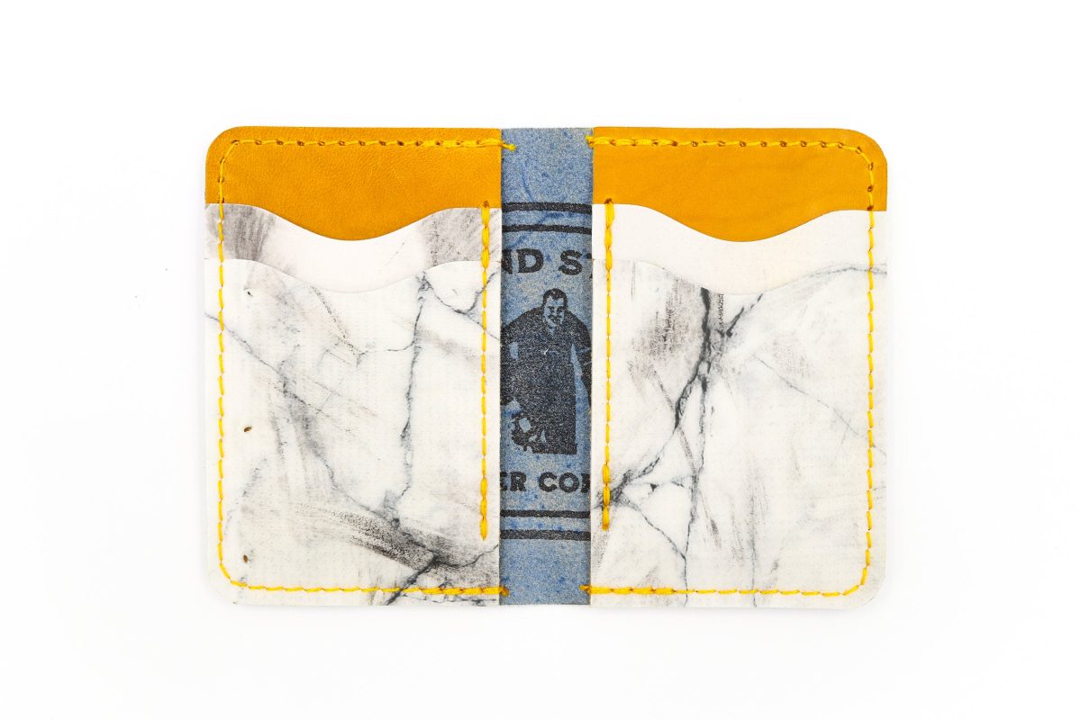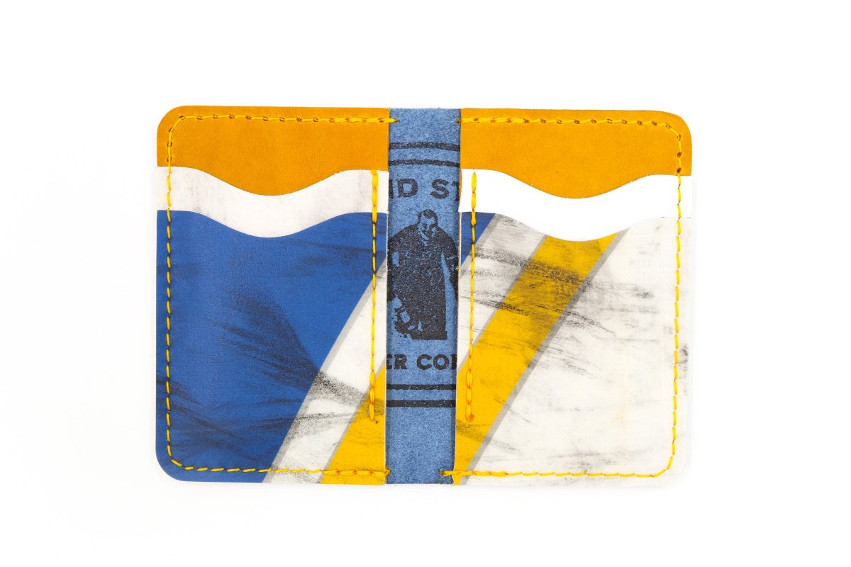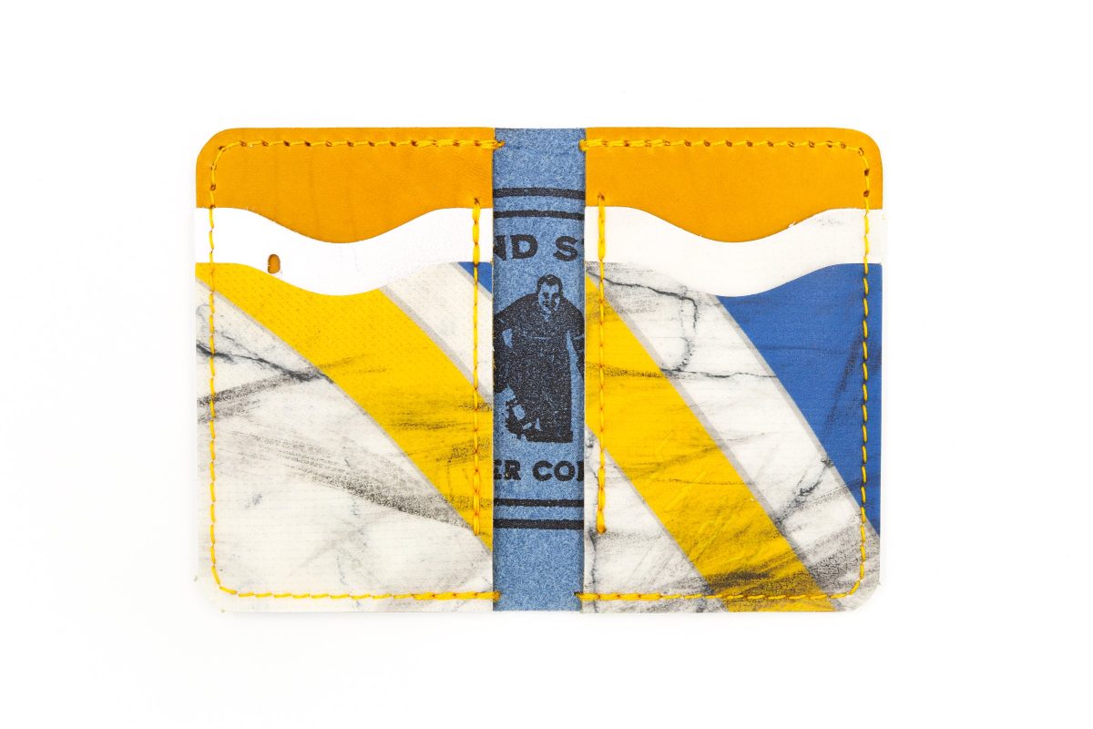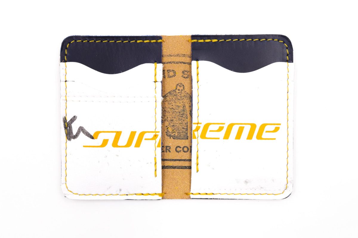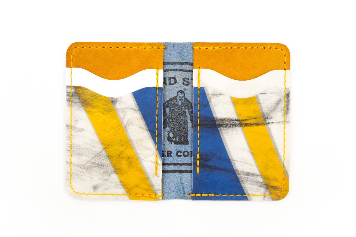 The 6 Slot Wallet is handcrafted from full-grain, oil-tanned leather and fused with vintage goalie gear leather. It features six card slots, two of wh